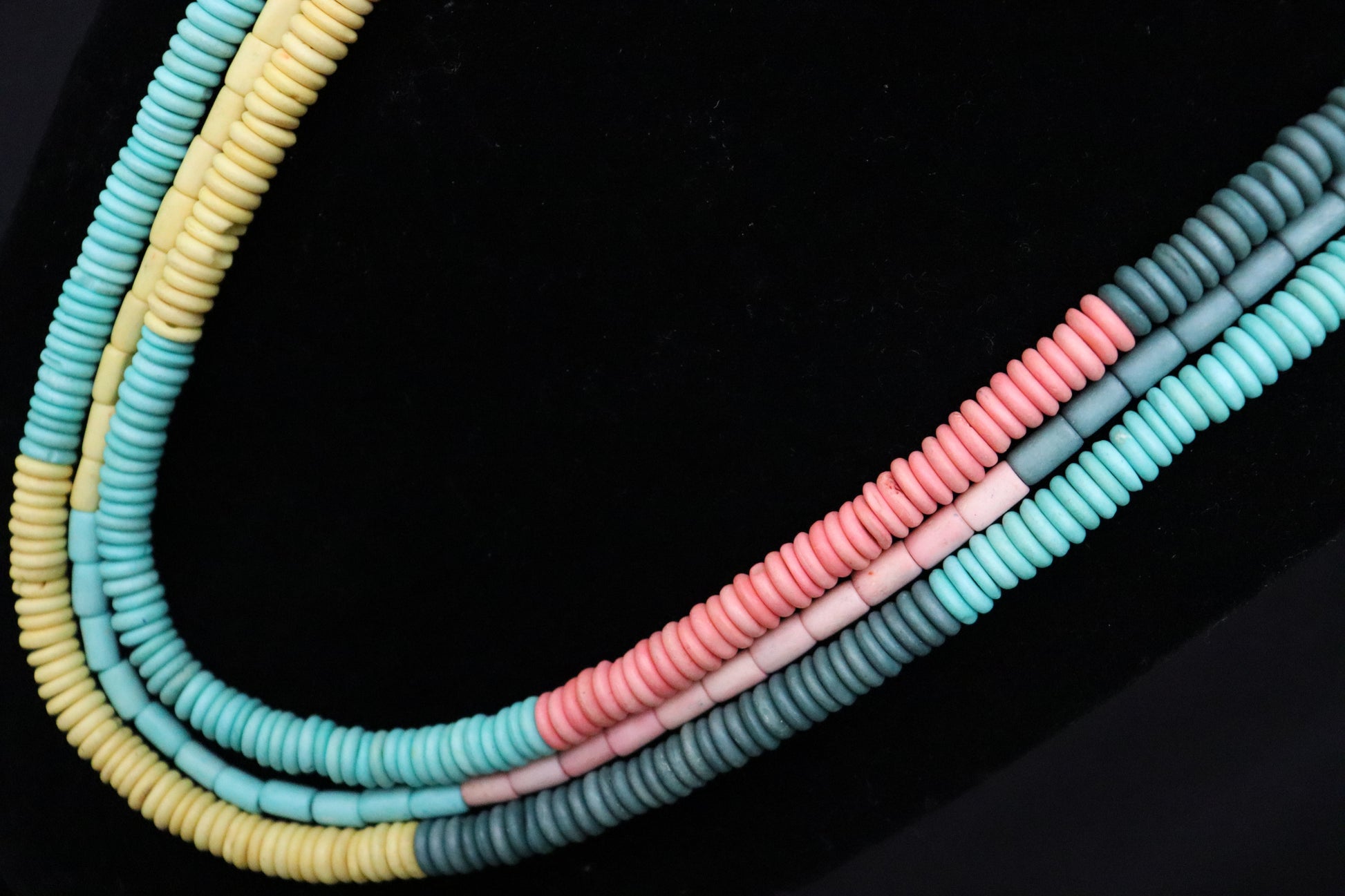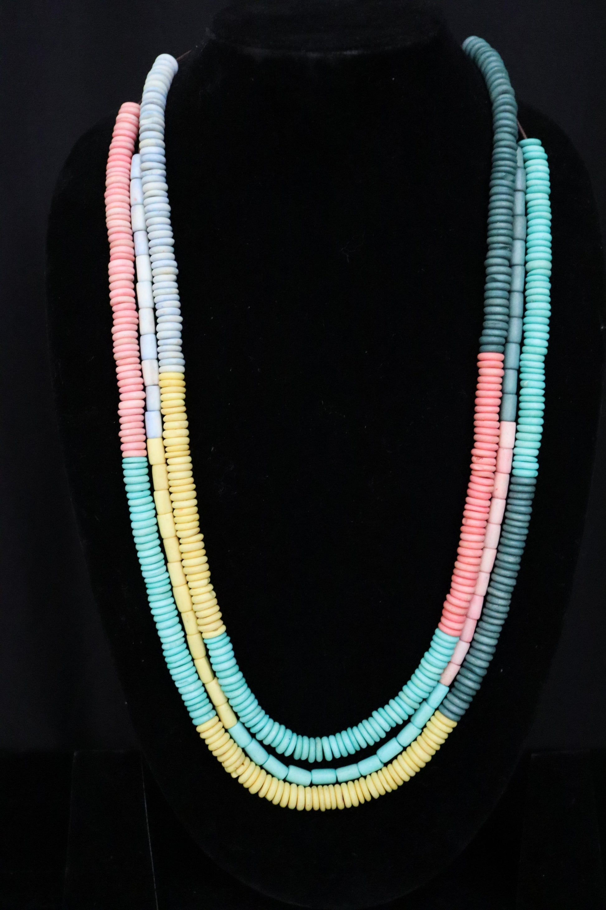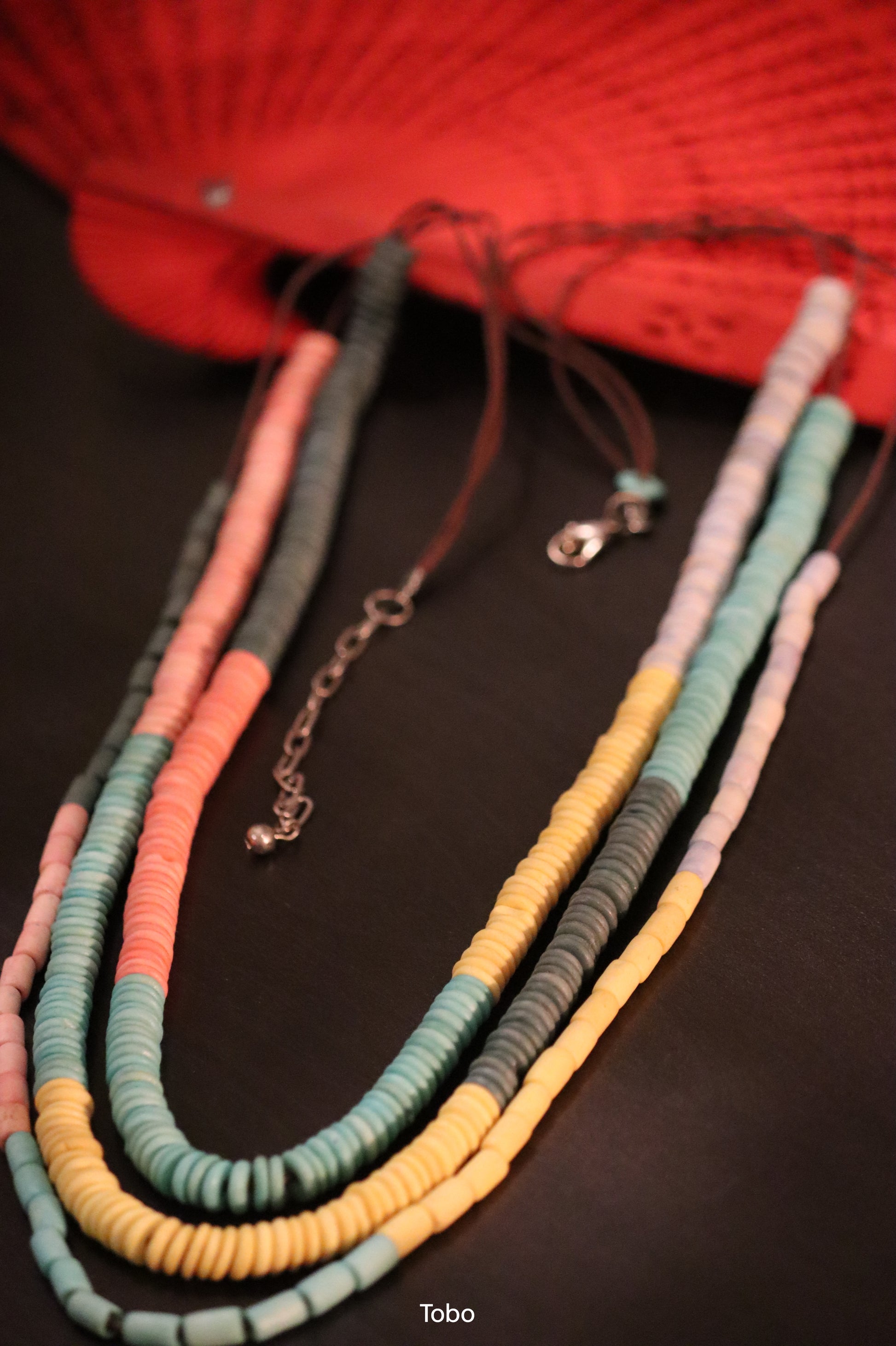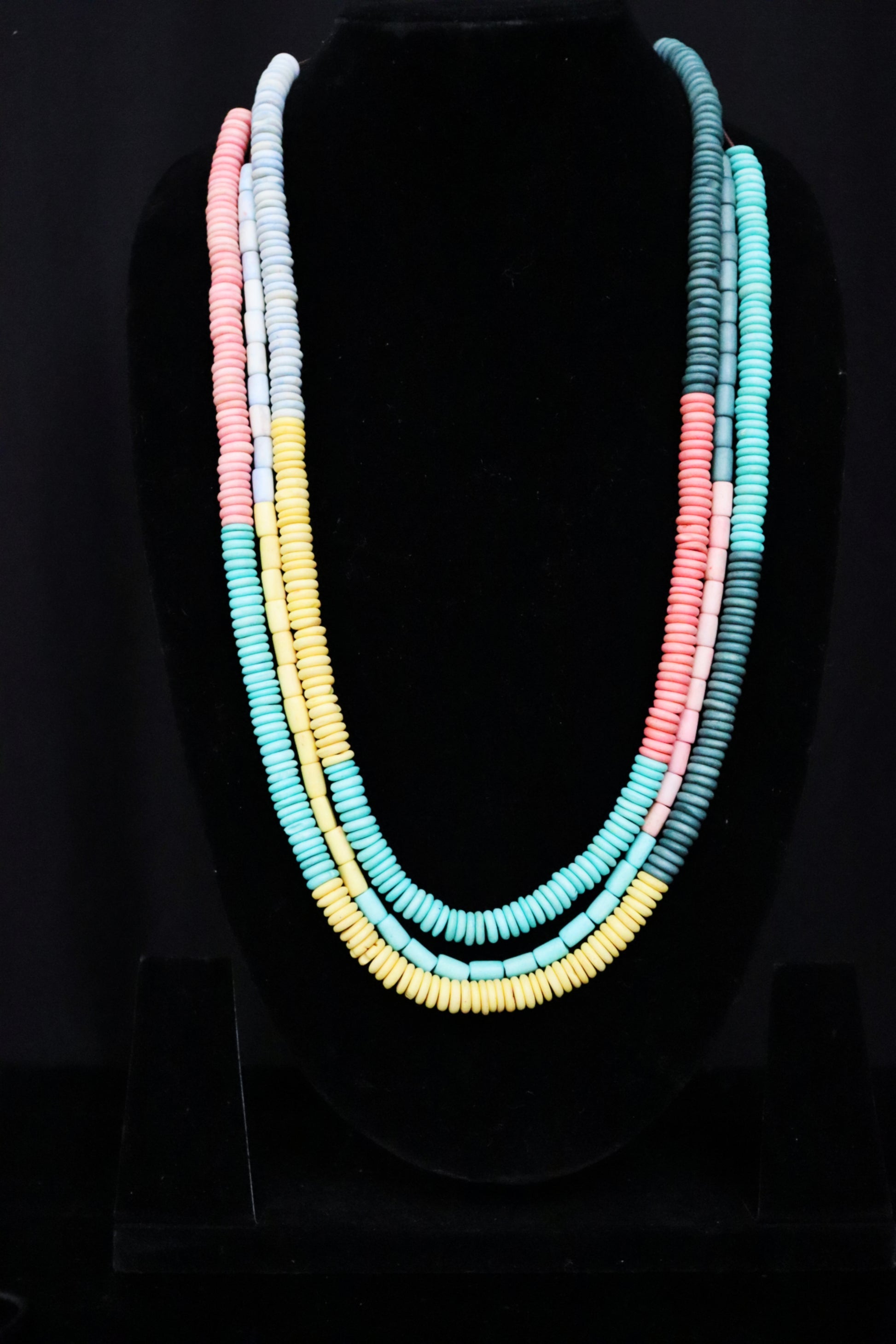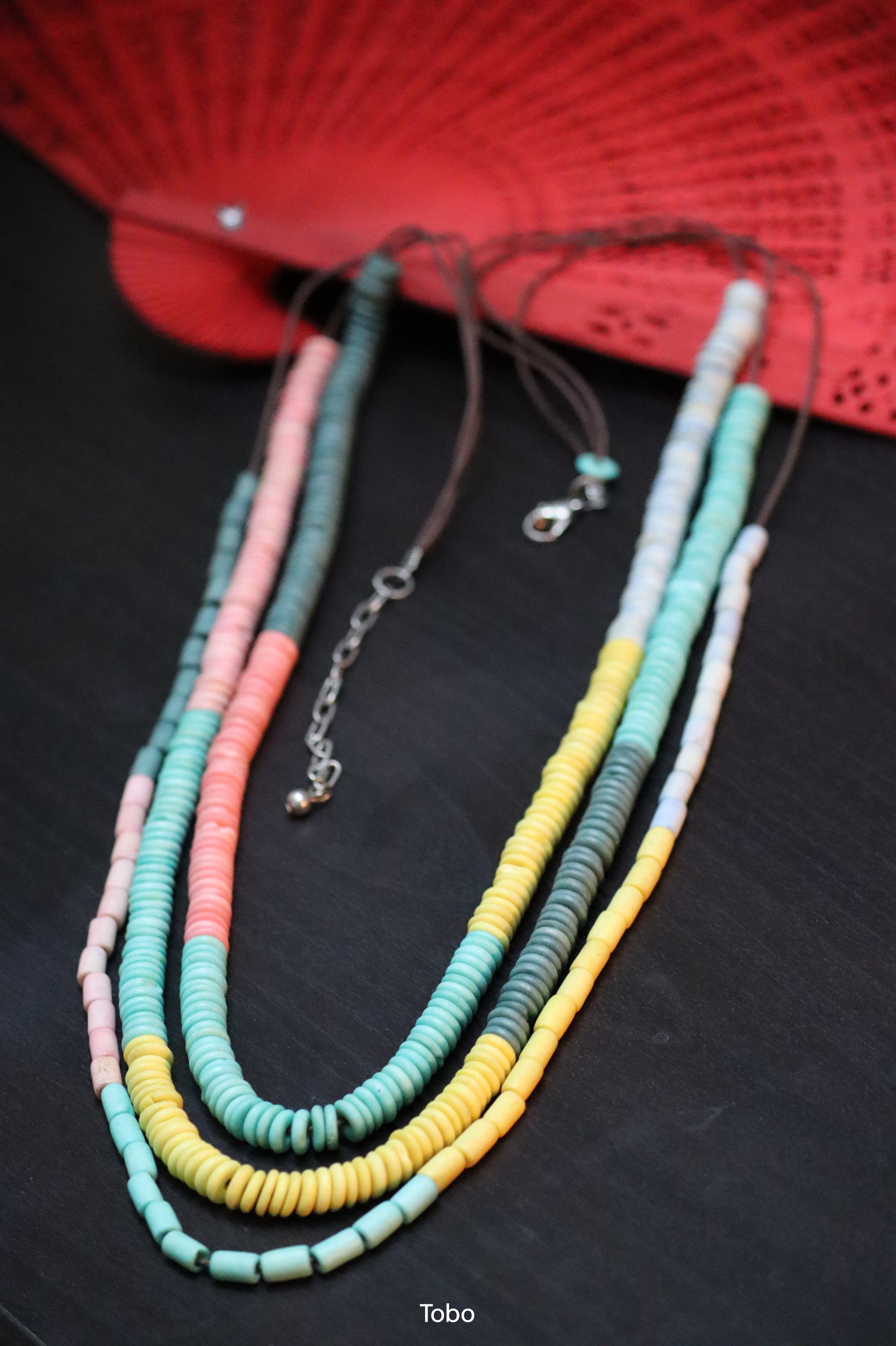 This charming neckpiece features small, wooden beads in an array of candy colors. The beads are intricately strung together, creating a delightful statement piece that adds a playful touch to any outfit. Lightweight and comfortable to wear, this neckpiece is perfect for adding a pop of color to your look.