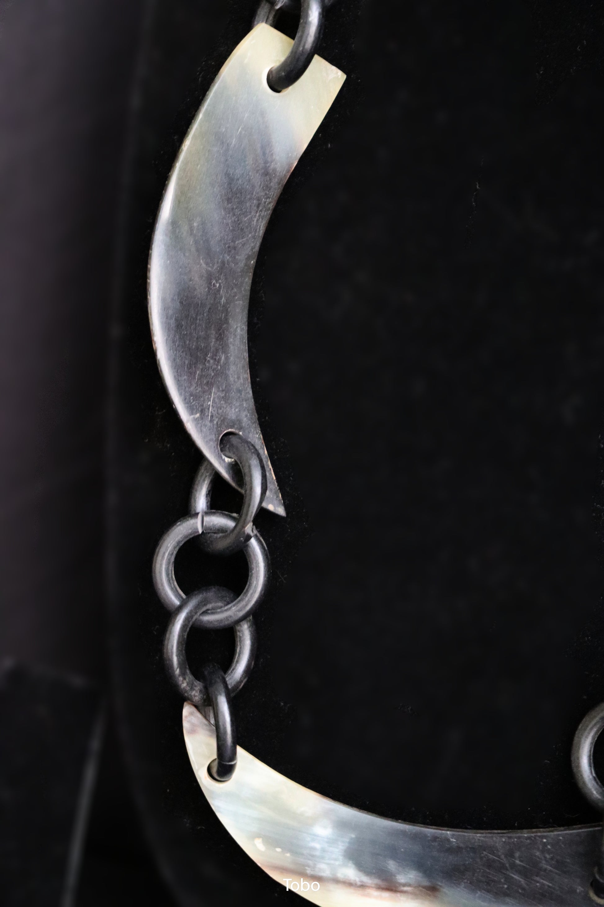 The Resin Blade Medley Necklace is crafted from resin knives and interlocking rings, this necklace exudes an edgy sophistication, blending the allure of danger with timeless elegance