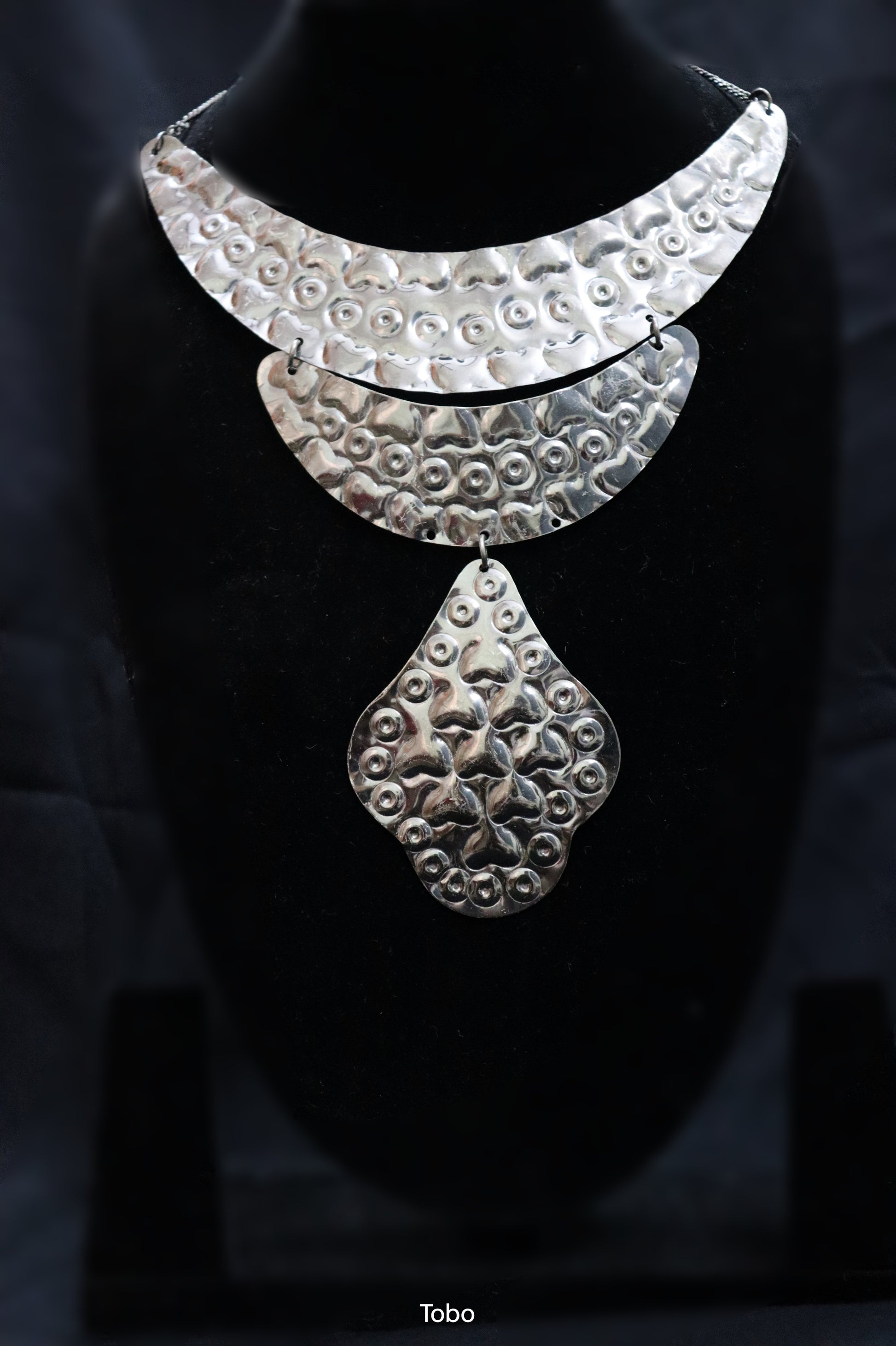 Imagine a statement piece that effortlessly commands attention—the bold silver necklace with its prominent, substantial chunk is a masterpiece of contemporary elegance. Crafted with meticulous artistry, this necklace features a striking, oversized silver centerpiece that gleams with a mesmerizing brilliance