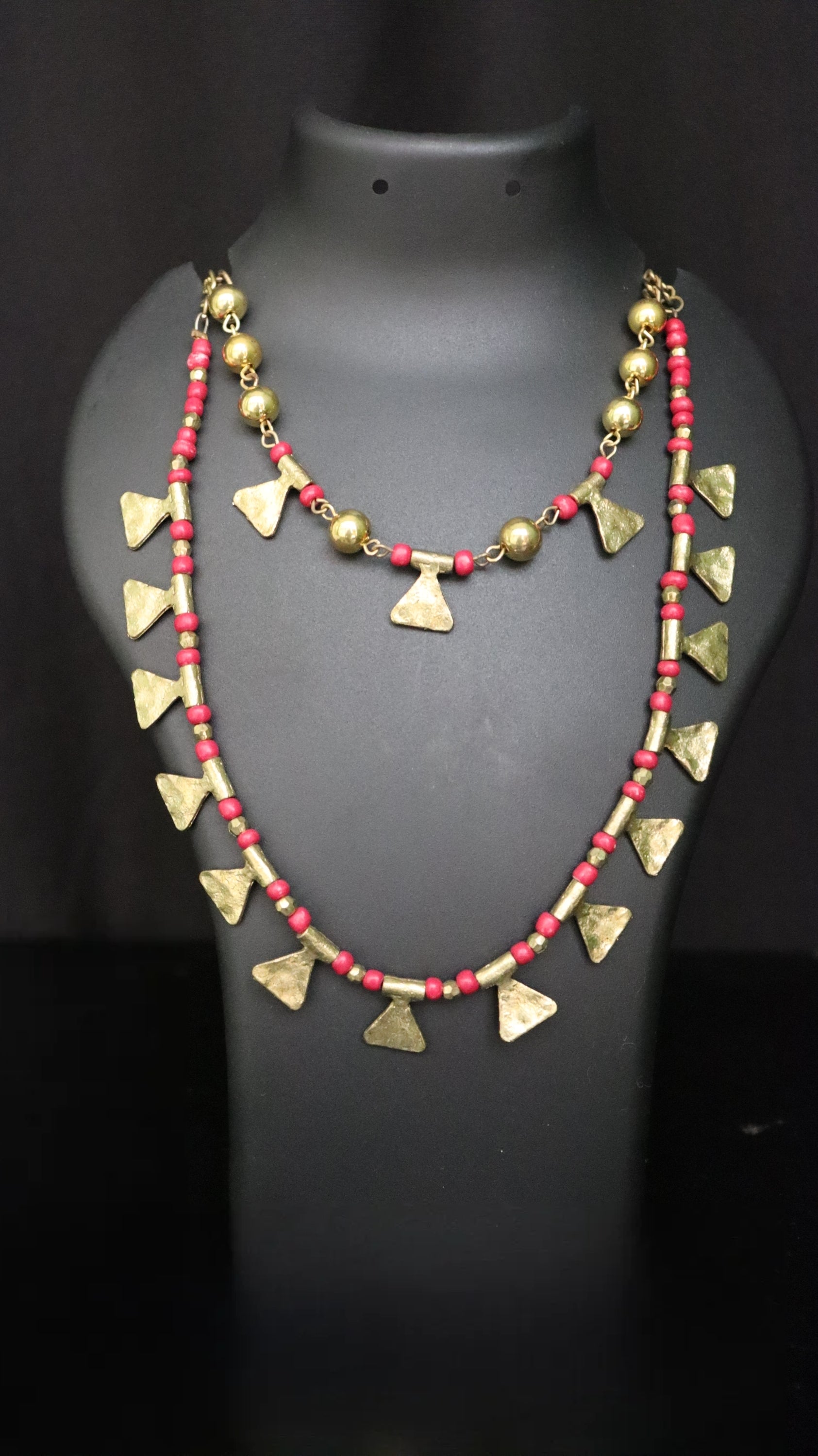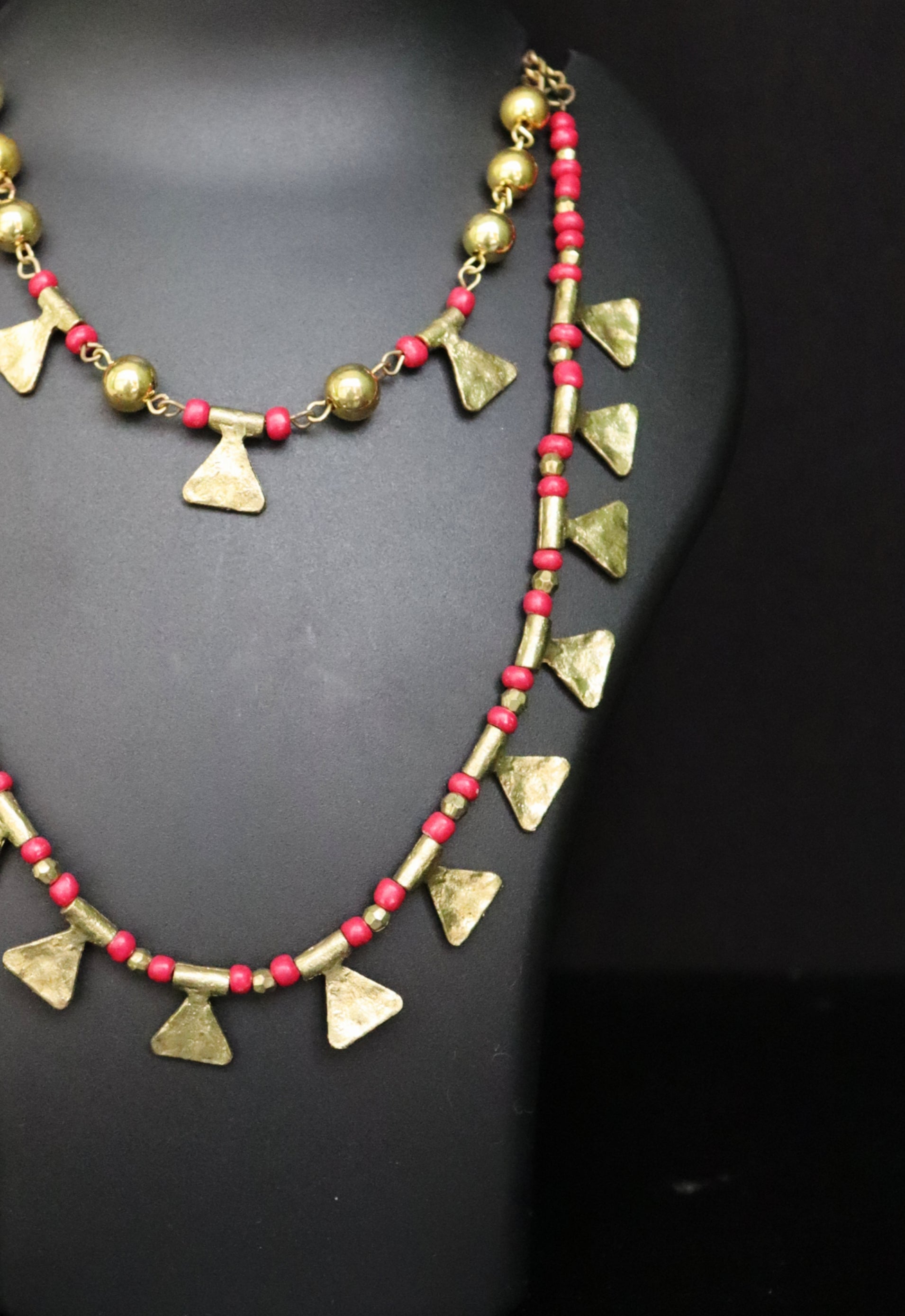 2. Statement necklace featuring two threads of glass and metal beads.